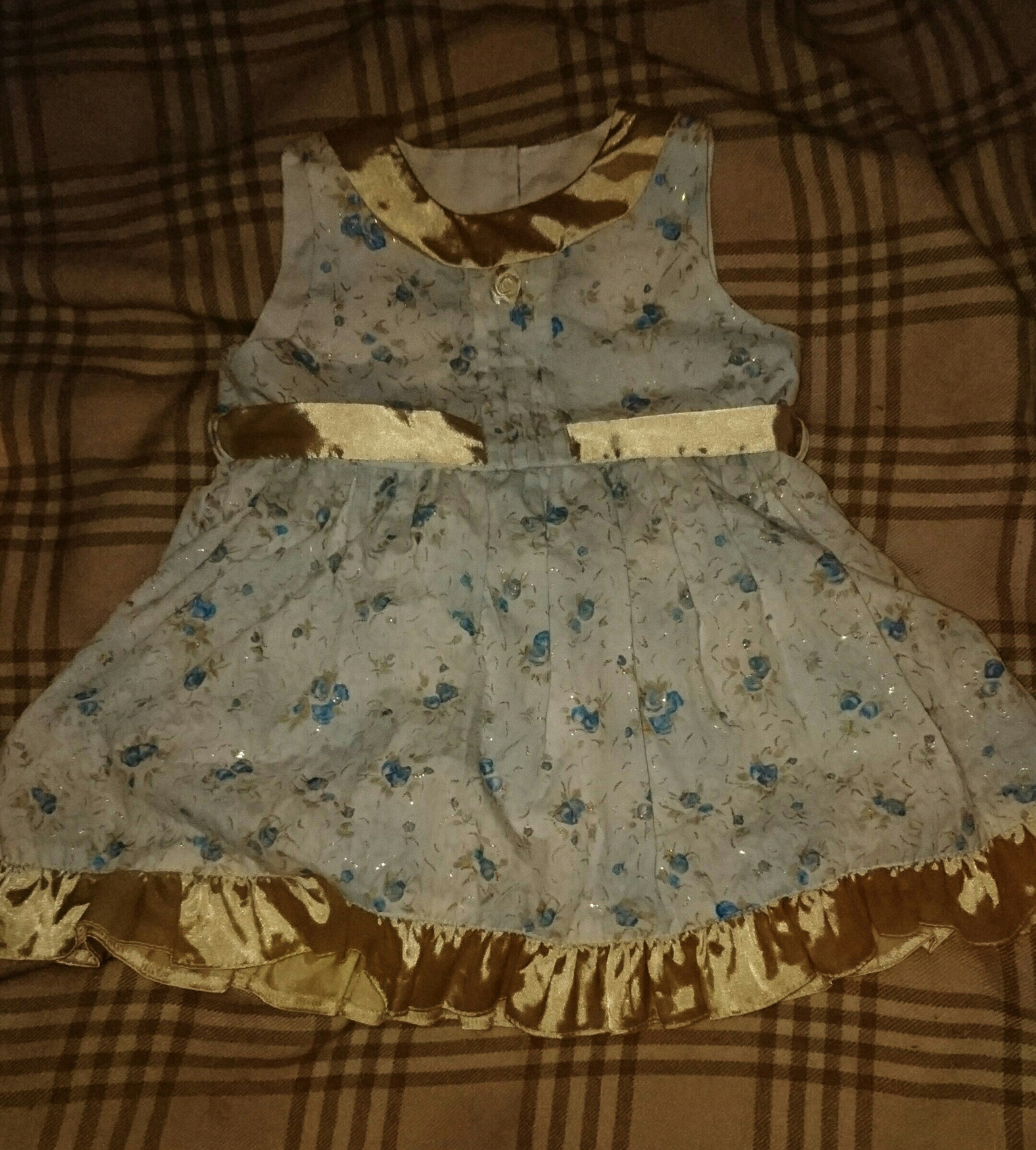 Небольшой золотистый принт по всему платью, отделка и пояс из атласа, внутри хлопковый подъюбник.